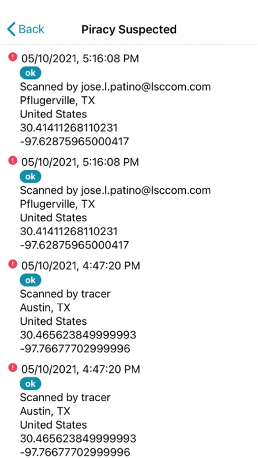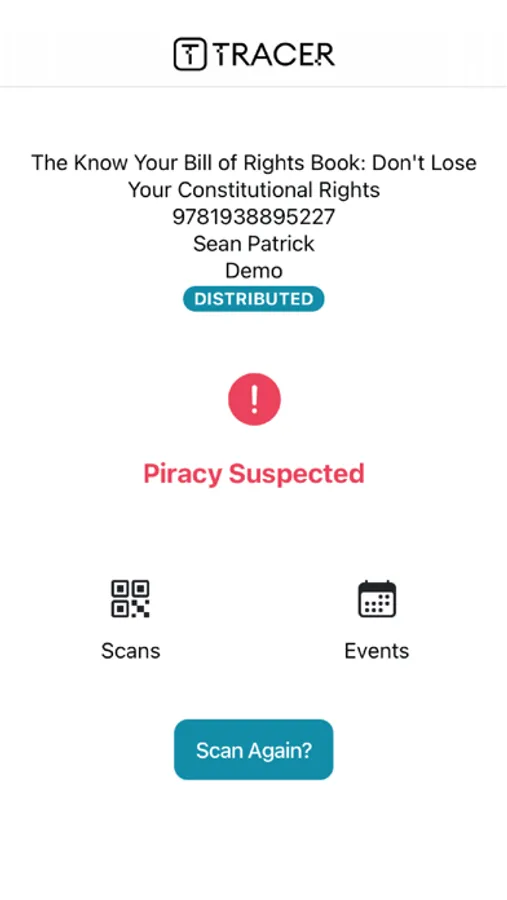 IntercepTag Tracer scans Lakeside Book Company IntercepTags and displays the metadata related to the book. It will also return other scans that are suspected of piracy.