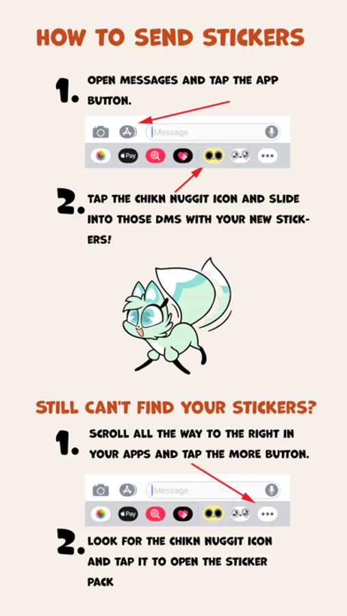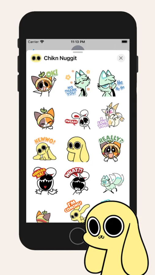 A collection of cute and ridiculous animated stickers of Chikn Nuggit and his fast food animal pals. Delight and weird out your family and friends by filling their DMs with these adorable little buddies. Follow @chikn.nuggit on TikTok for more animated antics!
