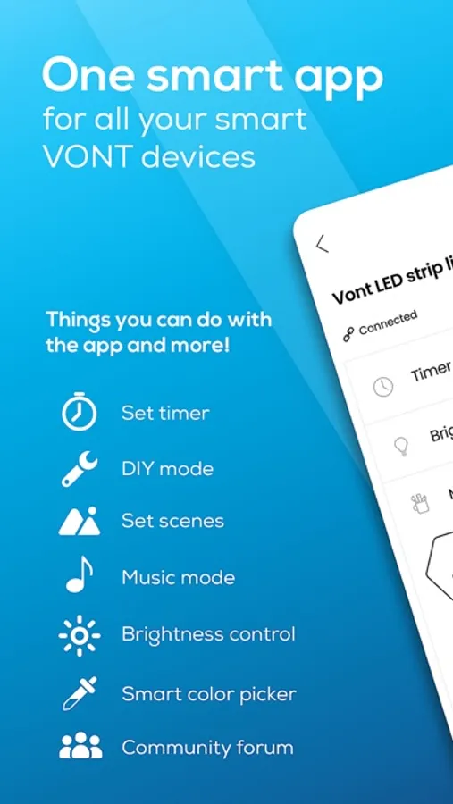 The app houses all the commands for your Vont smart home devices. When synced in, it maximizes the products’ features, so you can enjoy all the good stuff. Change the brightness, set the timer, and play with the 16 million colors available on the Strip Light and Smart Bulb. Plus other fun automation you can do with just a few taps in the Vont Home app.
