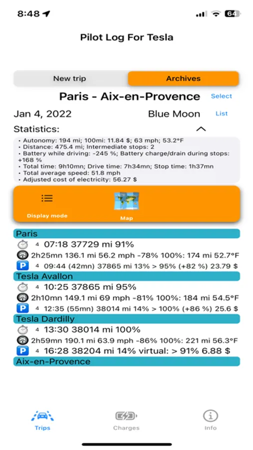 Pilot Log for Tesla, an integrated solution to automatically log your long trips and to easily record all your electric charges, allows you to answer these questions and more.
