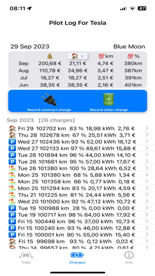 Charges done during a trip logged with the app are automatically available in the charges history and for charges statistics.