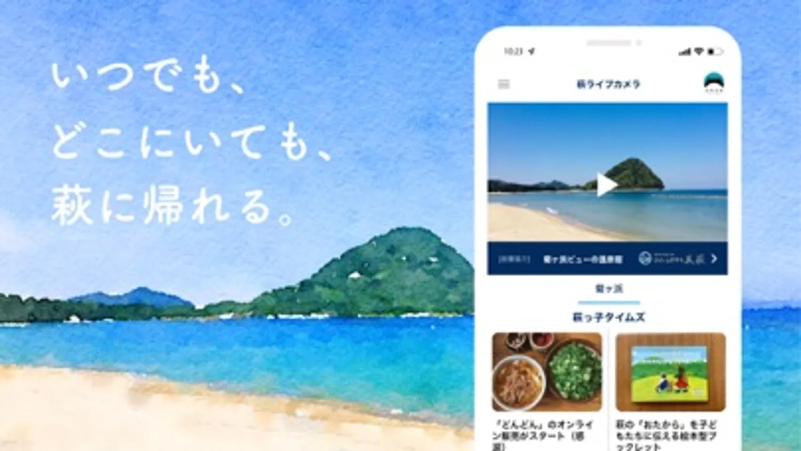 萩で生まれ育ったみんなへ。いつでも、どこにいても、ふるさとに帰れるように。山口県萩市の「菊ヶ浜」をライブ配信するアプリをつくりました。ふるさと萩の情報もおとどけします。萩出身チーム・萩大志館と、地元の仲間で、運営しています。