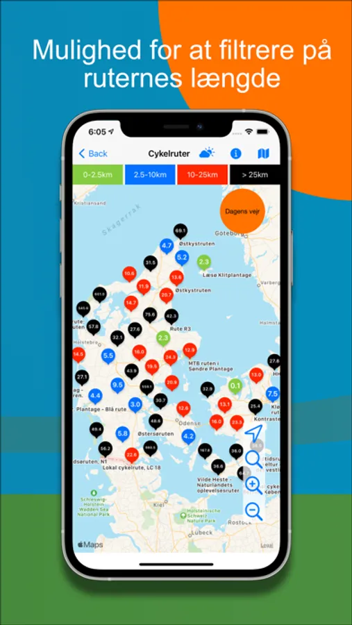 Zoom ind på det dynamiske kort og læs navnene på ruterne. Via menu-baren i toppen er der mulighed for at filtrere på ruternes længde. Ruternes længde vises på ikonerne der markerer ruterne.
