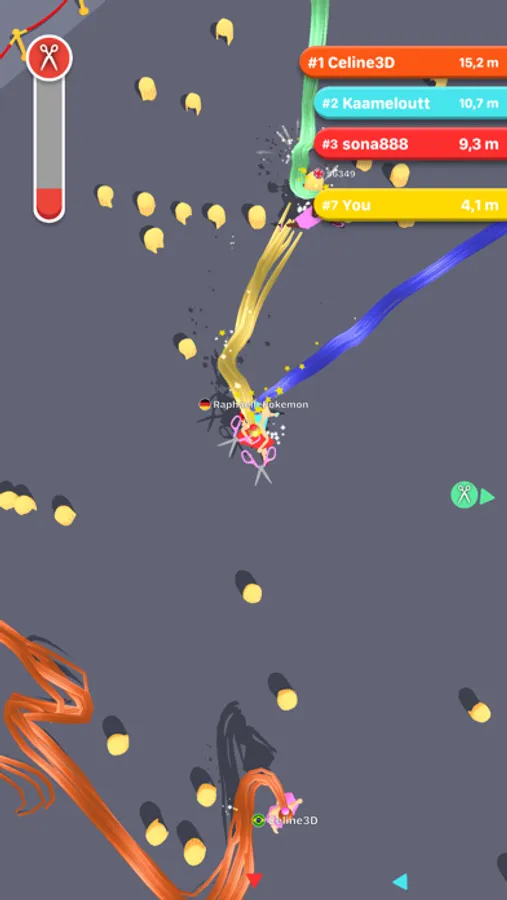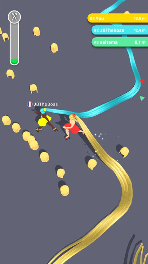 Grow your hair as fast as you can but be sure not to trip over the other players. Trap them in your lovely curls to trip them up first or chase them around with a pair of scissors. Snip snip snip! Watch out that your own beautiful hair doesn't get cut though.
