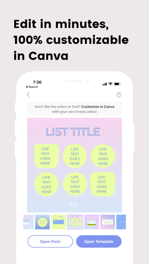 If you were struggling with aligning your branding from template to template using Canva’s free template database then our app is for you. Categorized by design packs, you can easily find all types of graphics within the same brand design so you have a cohesive feed no matter the content type.