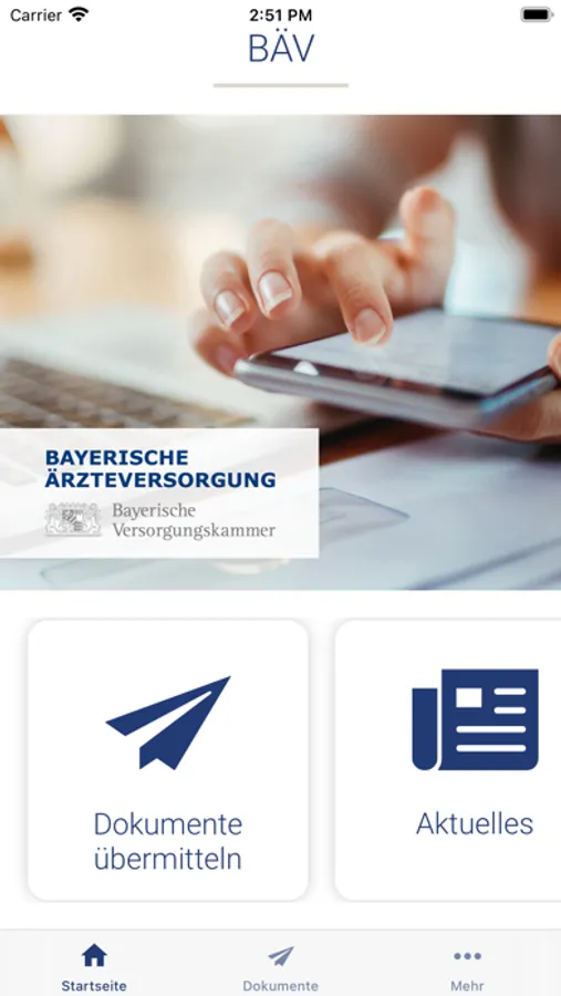 Die BÄV-App dient dem einfachen und sicheren Einreichen von Dokumenten und Formularen beim Versorgungswerk. Darüber hinaus bietet die Anwendung auch aktuelle Nachrichten zum Versorgungswerk sowie Informationen rund um die berufsständische Altersversorgung.