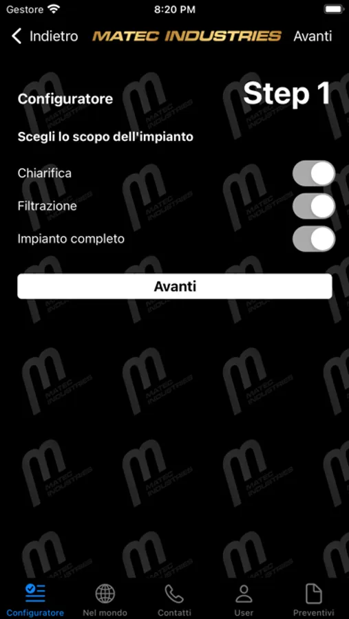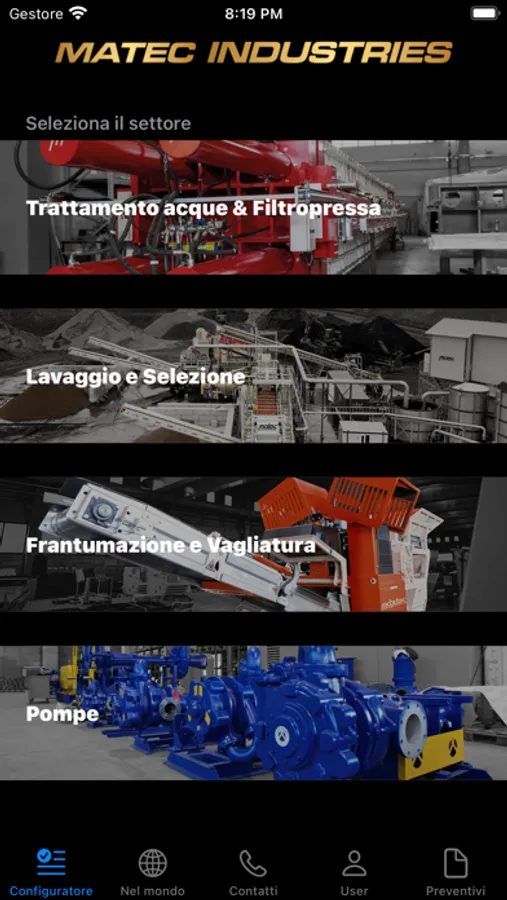 Matec app allows you to configure your system. Enter the purpose of the plant you need, the material to be treated and the entry and exit data to be respected, we will recommend the best solution for your needs.