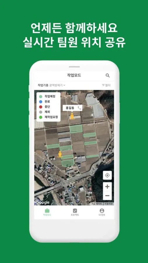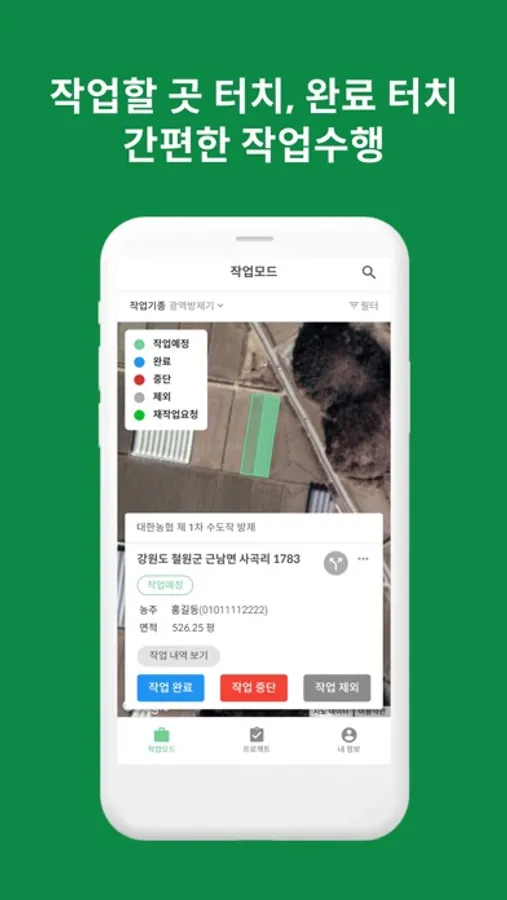 작업할 필지들을 지도에서 확인하고, 작업 완료/중단/제외 등을 기록할 수 있습니다.