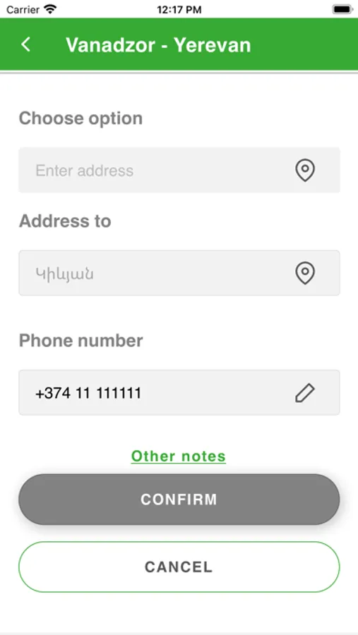 The pickup address is the point mentioned by the customer in Vanadzor, and the station in Yerevan is Barekamutyun street.