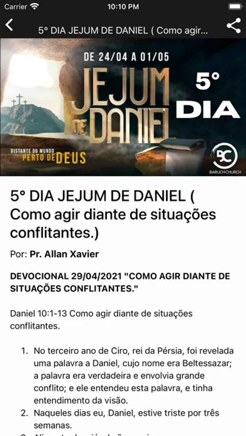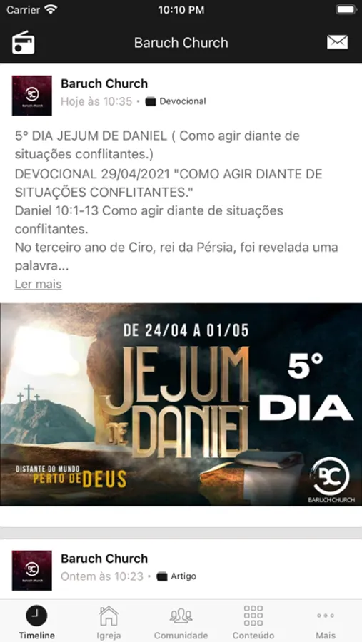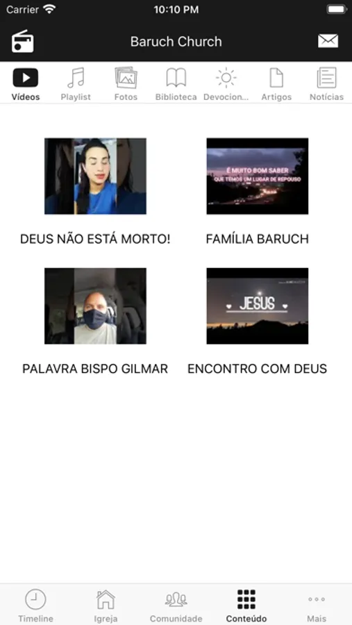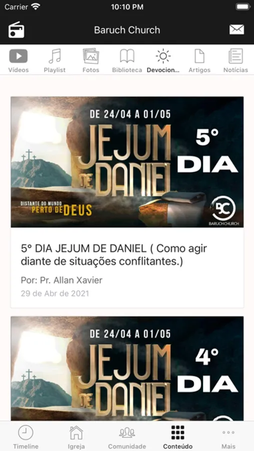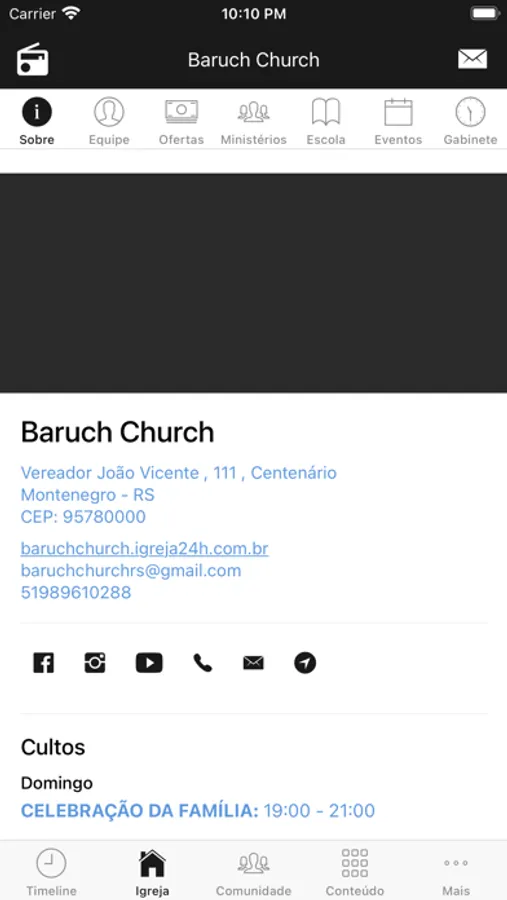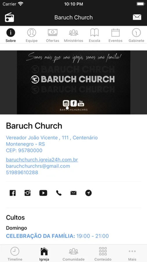 - Informações da Igreja (endereço, telefone, site, redes sociais, pastores)