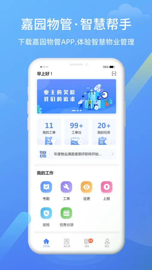 嘉物管是一款由嘉兴市城市投资发展集团有限公司与杭州海康威视系统技术有限公司联手打造的物业公司管理工具,包含工单管理、装修管理、车位管理、缴费管理、设备巡检、巡更管理、考勤管理等物业核心业务功能,帮助物业员工为业主提供更好的服务同时更轻松地完成工作,提升物业公司整体服务质量和效率。