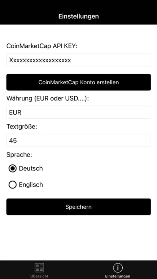 Anschließend müssen Sie nur noch einen kostenlosen Coinmarketcap Developer API KEY anfordern . Dieser wird unter Einstellungen in dieser App eingetragen.