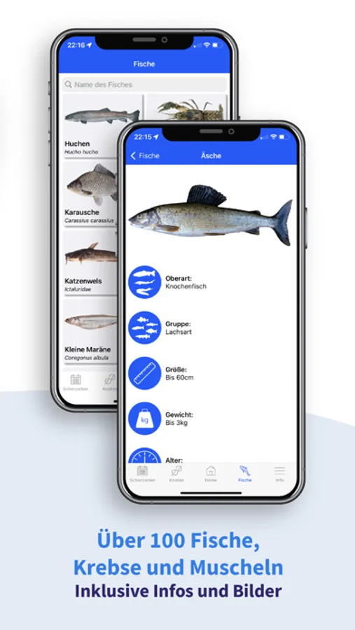 Verschaffe dir eine Übersicht mit mehr als 100 Fischen, Krebsen und Muscheln anhand professioneller Fotos und Begleittexten. Über die Filterfunktion kannst du gezielt nach deinem Wunschfisch suchen. Oberart, Gruppe, Größe, Gewicht, Alter, Lebensraum, Ernährung und Fortpflanzung sind die Attribute, welche wir dir mit präzisen Texten vermitteln. Alle Bilder können gezoomt werden, sodass du dir die besonderen Fischmerkmale in Nahaufnahme ansehen kannst.