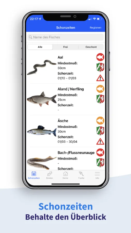 In der Rubrik Schonzeiten kannst du dir eine schnelle Übersicht über alle 16 deutschen Bundesländer verschaffen. Gute Filter- und Suchfunktionen runden dieses Feature ab. Ein sorgenfreies Angeln kann beginnen.