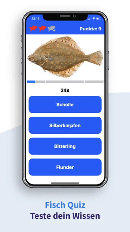 Quizze lokal gegen Freunde oder verbessere dein Wissen zu diversen Fischen in unserem Trainings-Quiz. Lerne spielerisch alle unsere Fische und bereite dich somit bestens für das Zeit-Quiz vor. Farbliche Hinweise und passende Sounds informieren dich über die richtigen oder falschen Antworten. In den Einstellungen kannst du individuell deine Fische auswählen und so gezielt lernen.