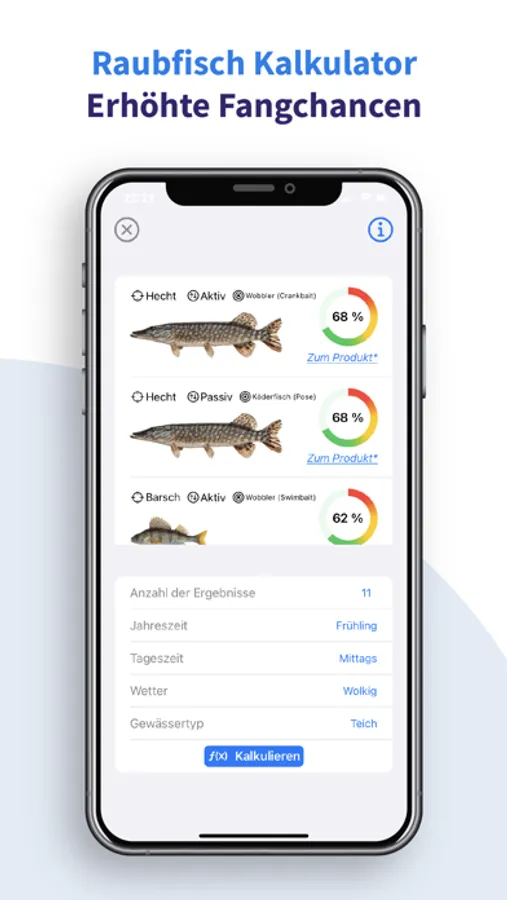 Dir werden Zielfische, Fangmethoden und deren maximale Fangchance berechnet und sortiert angezeigt.