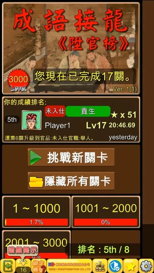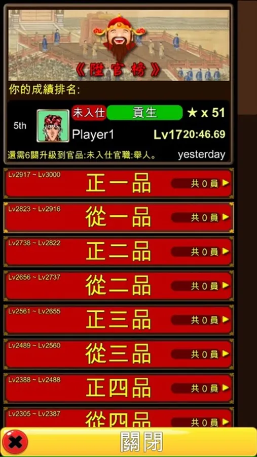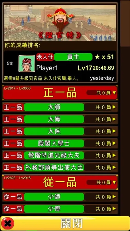 請來接受【成語接龍-陞官榜】的挑戰,除了可以精進成語知識外,試試看您的學識最高能夠勝任清朝的哪一品官階呢?
