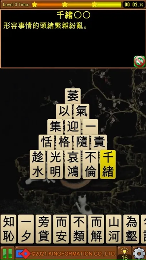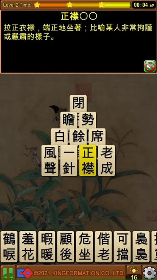 遊戲節奏明快,配合畫面中的成語解釋及語音朗誦,在最短的時間把兩兩相應的句子組合。每一關出現的成語,最少十句,最多二十一句;由易漸難。