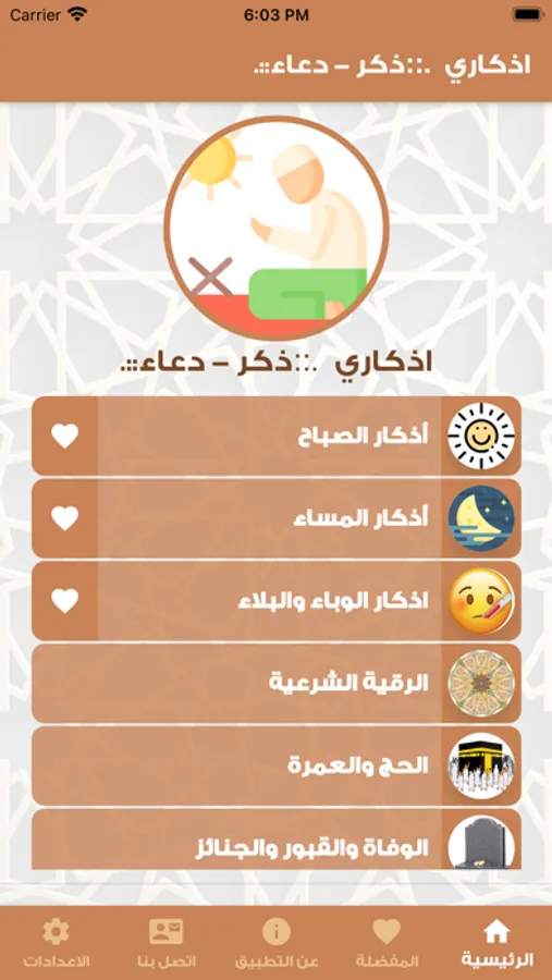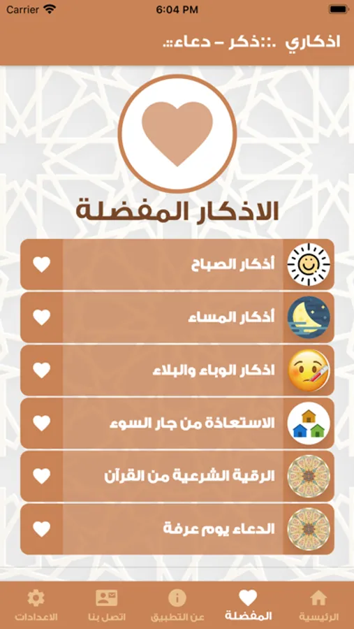 - يتضمن التطبيق ما يلي من اذكار وادعية: