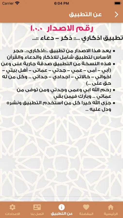 - هذه النسخة من التطبيق صدقة جارية عنى وعن (أبي - أمى - عمي - جدتي - عماتى - أهل بيتي - اخوالي - خالاتي - اجدادي - جداتي ... وكل من له فضل على...)