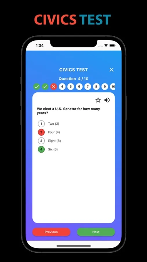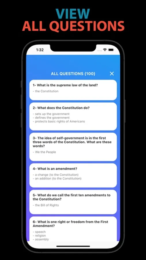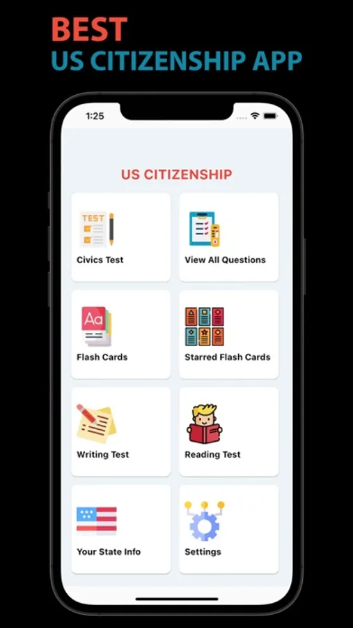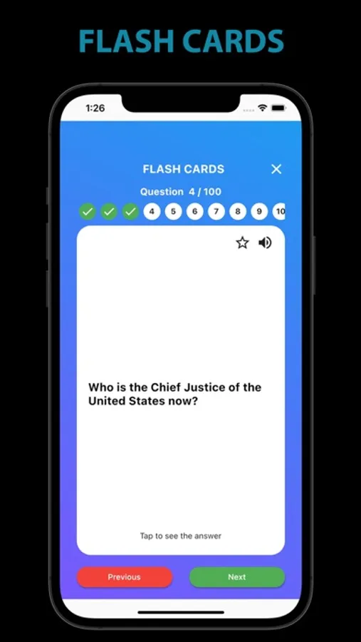 This app helps you study all 100 questions and evaluate your knowledge by taking a multiple-choice practice test (View questions in random orders), flash cards for all 100 questions and create your own flash card by selecting your favorites questions (Starred Flash Card). You can also enable audio for all Civics Test and flash card so that you can hear questions as you study.