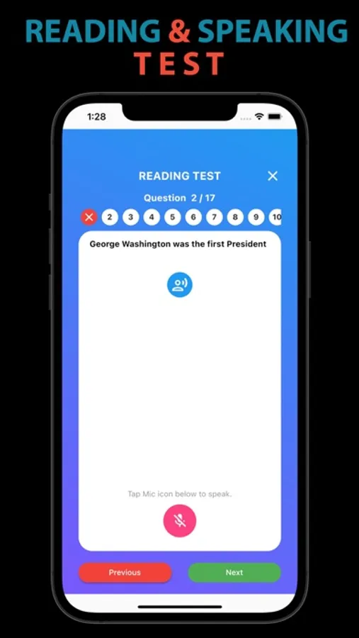 o Reading: You must read aloud one out of three sentences correctly to demonstrate an ability to read in English. This app helps you study for this reading portion of the test by asking you to read the given sentence and repeat it using your microphone. The content focuses on civics and history topics.
