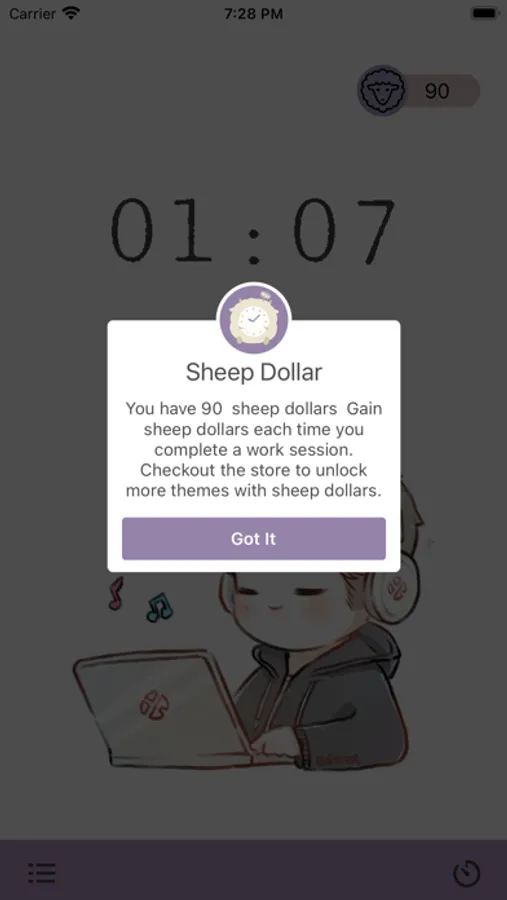 4. Earn 1 sheep dollar for every 4 minutes of work sessions completed. Spend sheep dollars in “Store” to unlock more themes
