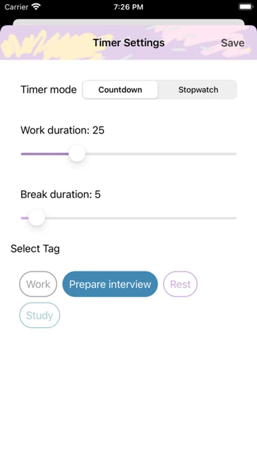 3. There are two types of sessions when the timer is in countdown mode: work and break. Each work session is followed by a break session. If the timer is in stopwatch mode, then all sessions are work sessions.