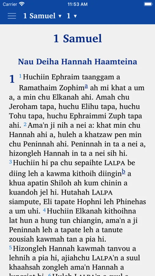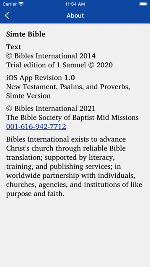 This app provides a translation of the New Testament, Psalms, Proverbs, and 1 Samuel of the Bible in the Simte language. It is produced by Bibles International, the Bible Society, Translation and Publishing Department of Baptist Mid-Missions.