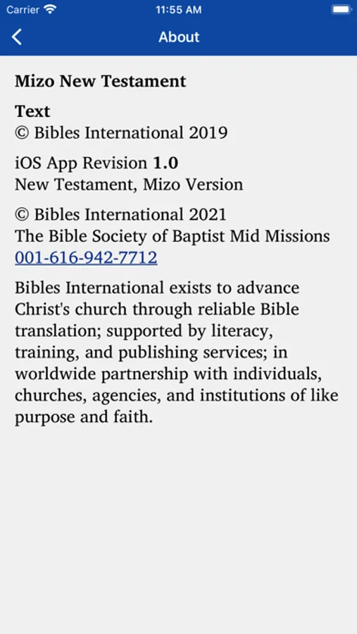 This app provides a translation of the New Testament of the Bible in the Mizo language. It is produced by Bibles International, the Bible Society, Translation and Publishing Department of Baptist Mid-Missions.