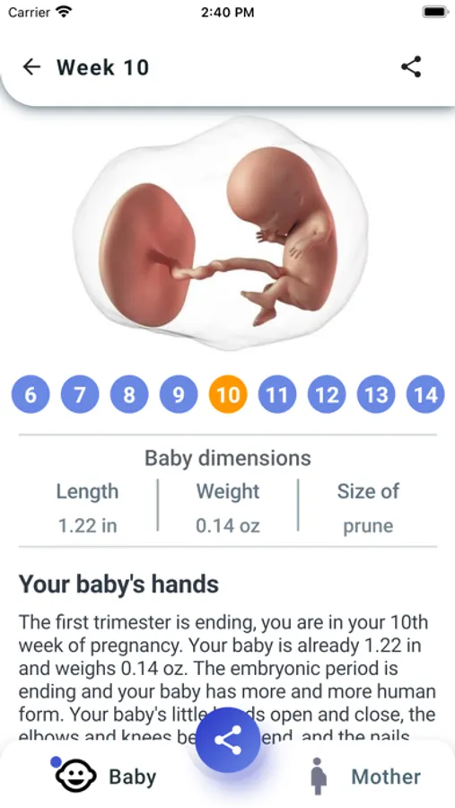 • Know week by week how much your baby weighs in your womb, how much your baby measures, and compare their size with that of a fruit for a better interpretation.