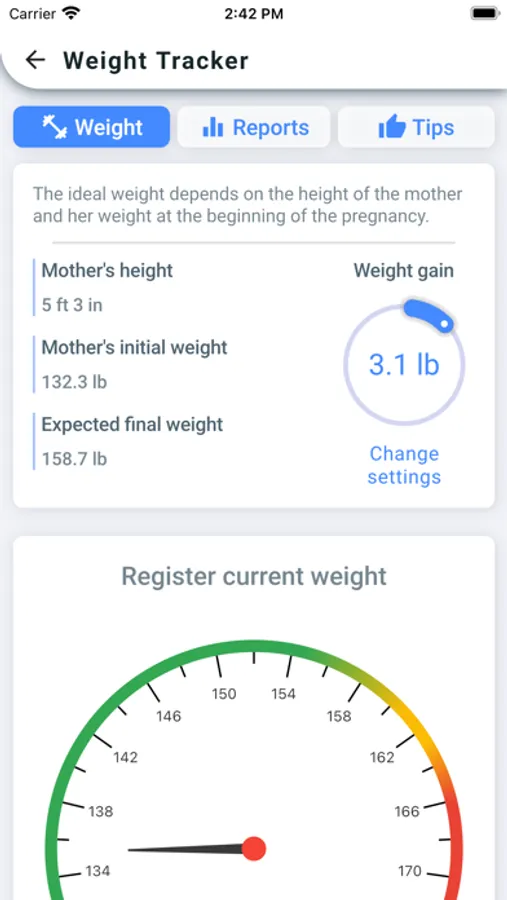 • Weight Tracker: Track your body weight. Perform your weighing every week, and verify that you are within the normal range, according to your weight and height before becoming pregnant.