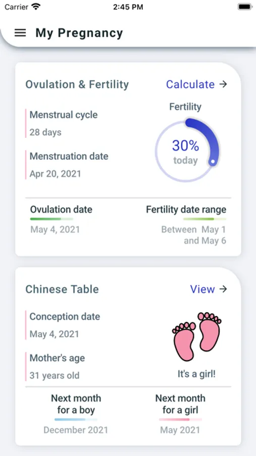 Do you want to get pregnant? With My Pregnancy Tracker, know the date of your ovulation, to determine your fertility days, and maximize the chances of having a baby. Use the Chinese Table to know the sex of your future baby before conceiving. And get all the information you need for your baby to develop day by day in a healthy way from day one!