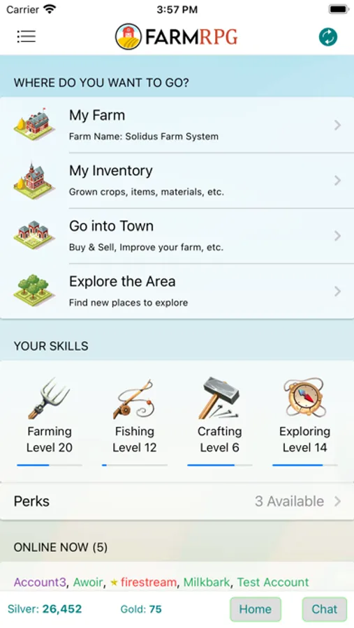Farm RPG is a simple, menu-based farming role playing game / MMO where you start a farm, plant crops, fish, craft and explore. As you play, a lot of fun things unlock for you to do on a daily basis. There's a world to explore with townsfolk to help and a community of players to work with and trade.