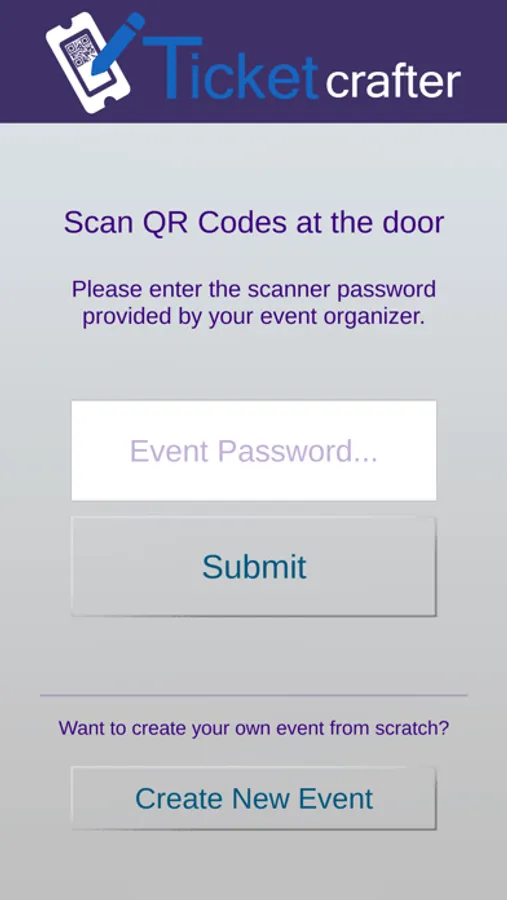 Enter your event password provided by the event organizer, and your phone turns into a scanner which will scan the QR codes on event tickets.