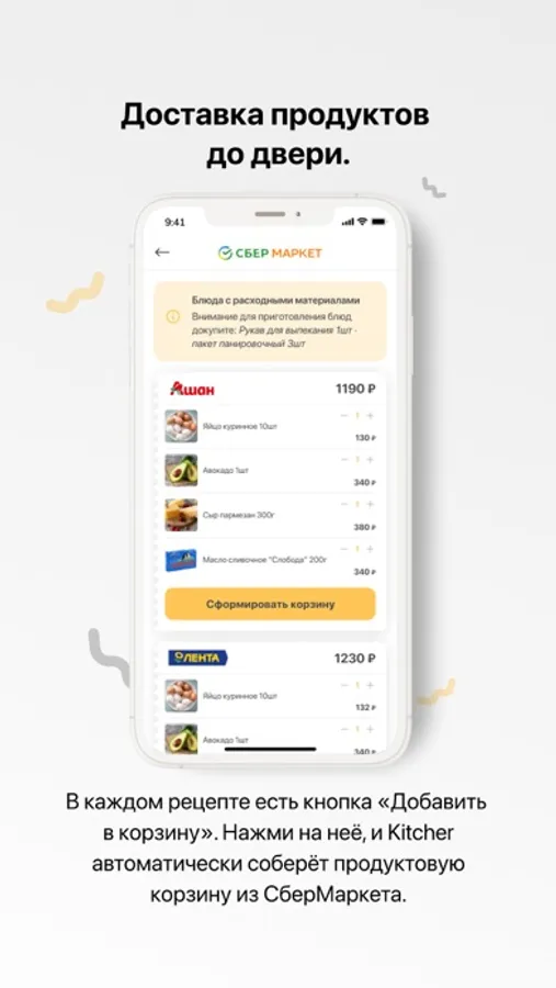 В каждом рецепте есть кнопка «Добавить в корзину». Нажми на неё, и Kitcher автоматически соберёт продуктовую корзину из СберМаркета.
