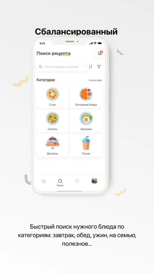 - Быстрый поиск нужного блюда по категориям: завтрак, обед, ужин, на семью, полезное, до 30 минут.