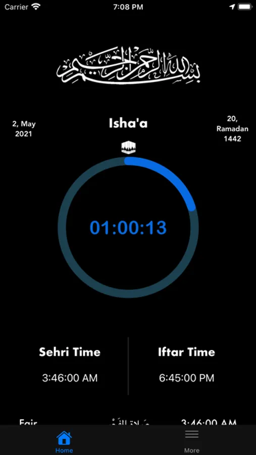 At home screen user can see remaining time in next prayer and as well as Qibla Direction in smart way. When scroll down, all Namaz timings can be seen, and highlighted Namaz will indicate current Namaz.