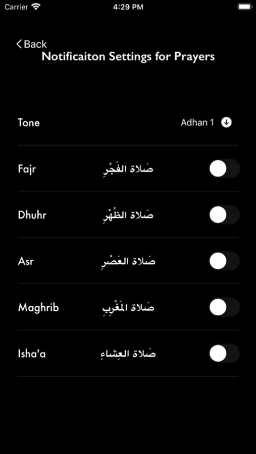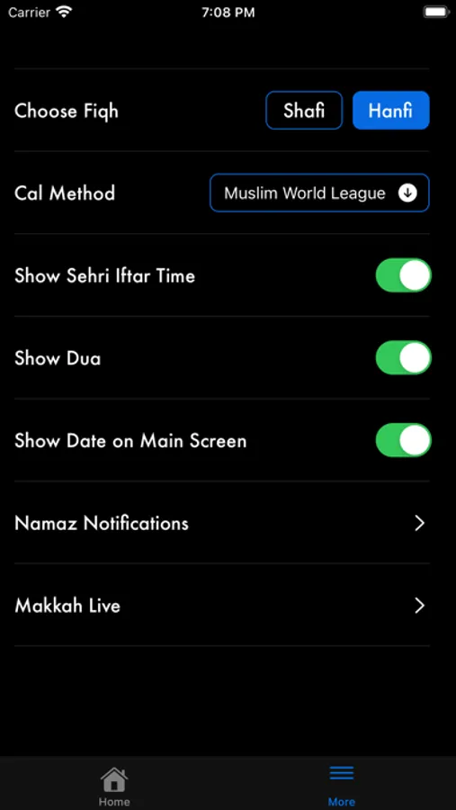 More screen has some settings with a beautiful Dua at the top of screen, which is changed randomly. This screen allows user to choose Namaz timing calculation methods, Fiqh and additionally Namaz Notifications button at the bottom which will take you to the next screen where you can turn on and off notifications for each Namaz individually. When turn on notification, then it will be valid for next 7 days. It means that if not open app within next 7 days then notifications will not be triggered but when app will be opened then again notifications will be valid for next 7 days.