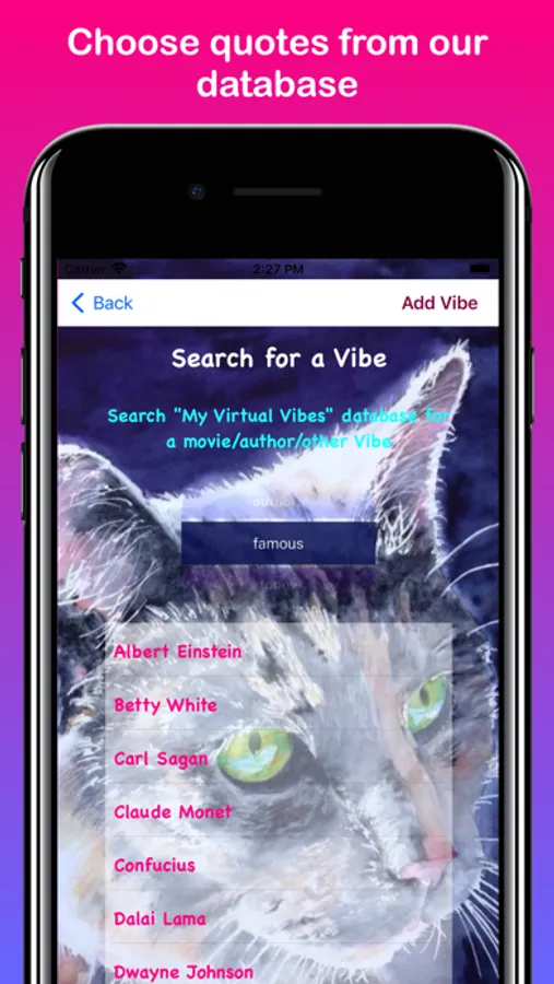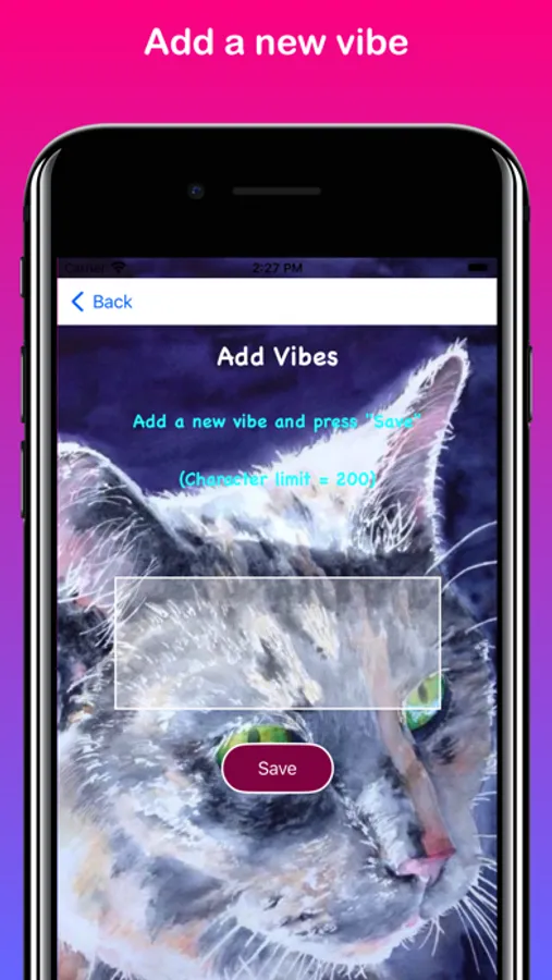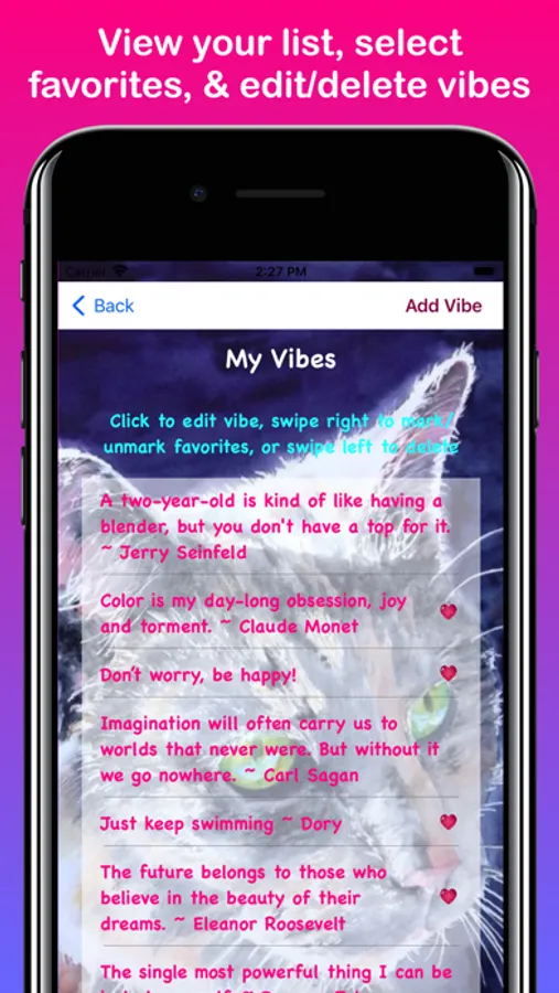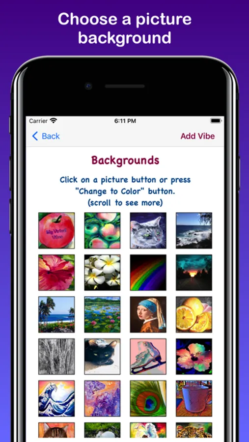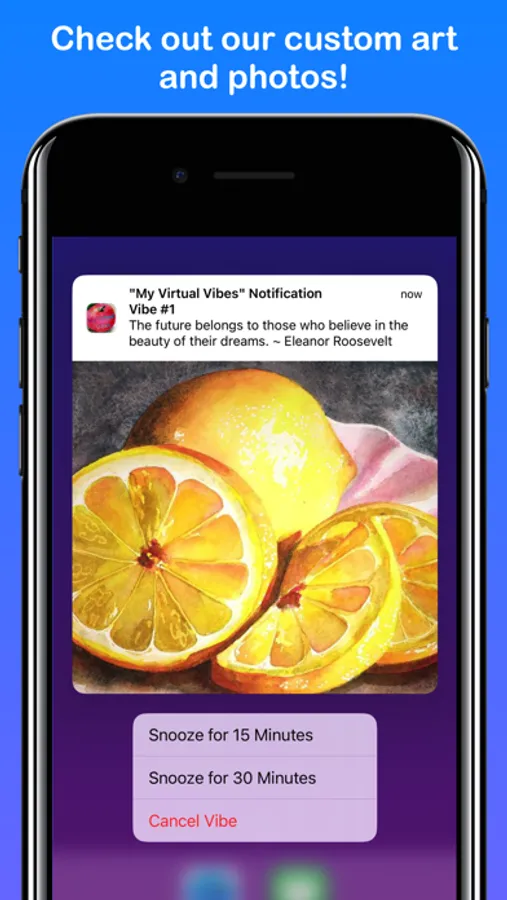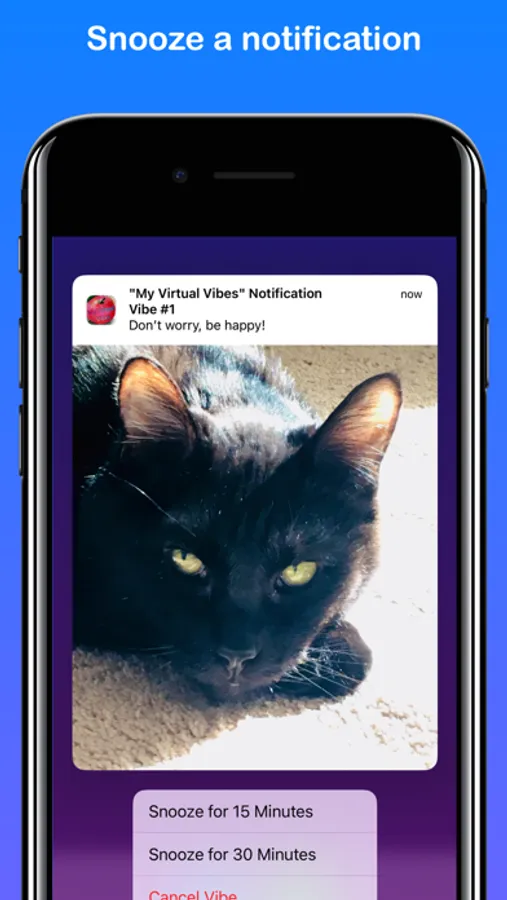 “My Virtual Vibes” allows you to input/save “Vibes”, or personal thoughts, in order to remind yourself about them during the day via iOS notification messaging. Vibes can be about famous quotes, inspirational sayings, motivational thoughts, self-reminders, or whatever you decide! You can add new vibes, edit vibe text, or delete vibes. You are also be able to select custom backgrounds/colors to display within the App itself. Notifications can be set for 30 minutes, 1 hour, 2 hours, etc. between specific times of the day. Notifications can also be “snoozed” for 15 or 30 minutes. “My Virtual Vibes” notifications are displayed with beautiful art and photos created by the App developer. They can be clicked on to see more detailed information within the App. Notifications also appear on paired Apple Watches. Sometimes it’s just nice to reflect and simply remind yourself about what’s important to you. So, cut through all the noise, listen to yourself, and get “My Virtual Vibes”!