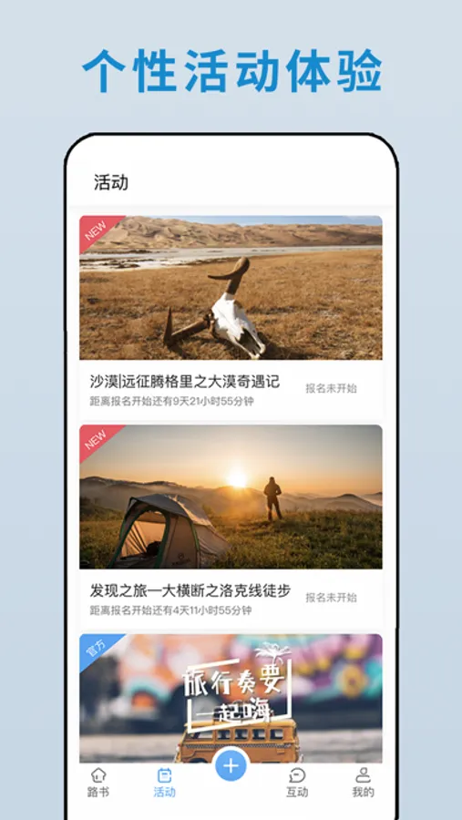在“云路书”上发现最酷炫的活动,自驾、探险、露营、潜水、漂流、滑雪、跳伞、攀岩、越野跑等,你想要的户外活动我们都有,让你分分钟成为朋友圈里的酷炫旅行户外小达人。