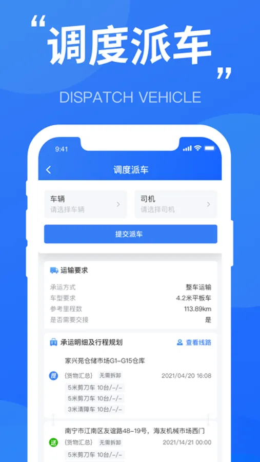 3、调度派车,基于受理的订单可以指派车辆和司机