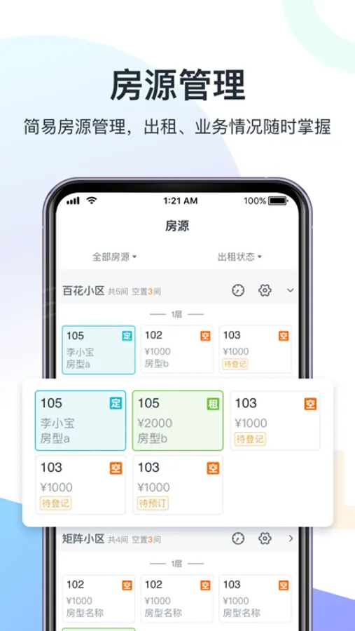 房源管理:支持合租&整租&集中式房源管理,出租、业务情况随时掌握。