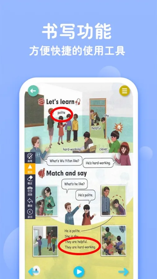 【4】画笔功能,全屏涂鸦让学习更加的有趣让学习更加高效率。完全同步最新发行教材,绝无缺漏页现象。