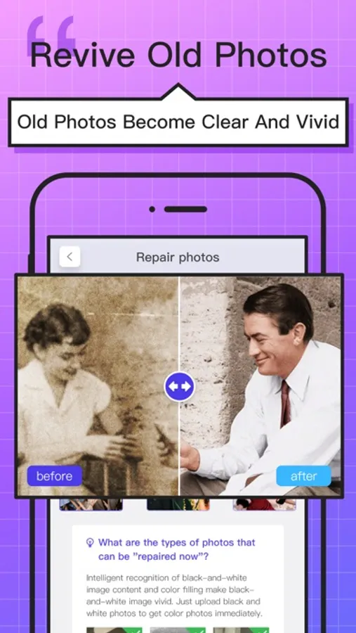 AI restoration of old photos is available immediately. Old photo repair is an easy-to-operate, professional photo repair APP for repairing.