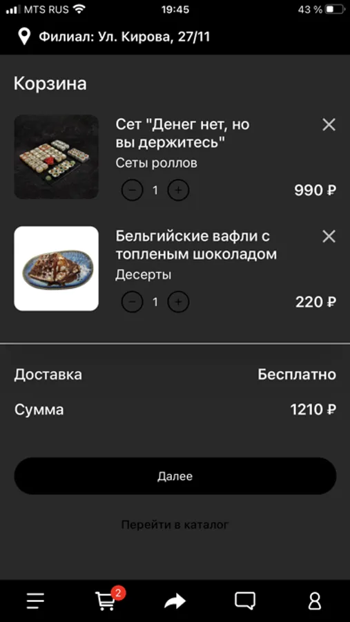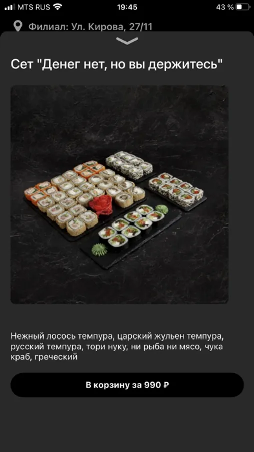 Чтобы сделать заказ, теперь не нужно ожидать очереди на телефонной линии. Для оформления заказов, нужно всего лишь несколько касаний. Огромный выбор не только отдельных блюд, но и сетов!