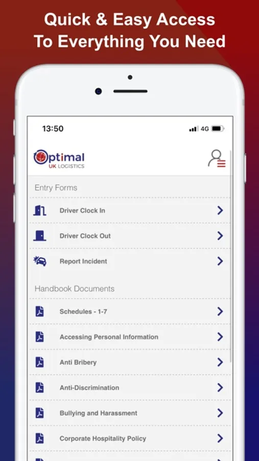 The official Optimal UK Logistics app enables drivers to access their invoices, change their personal information, view hand books, submit required daily forms and receive updates and notifications from assigned managers.