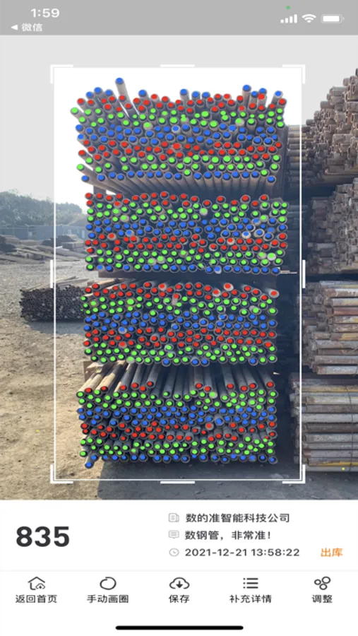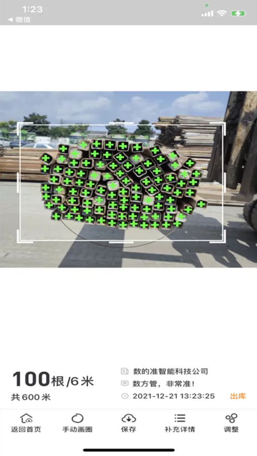 数的准APP采用人工智能技术,通过拍照清点出图片中物体的数量。单张可识别3000个以内的数量,0.5秒给出数据。目前可以数钢管、数钢筋、数方管、数方木、数原木、数盘扣、数轮扣、数工字钢、数椭圆形管、数圆管、数凹槽钢等点数相机的功能。