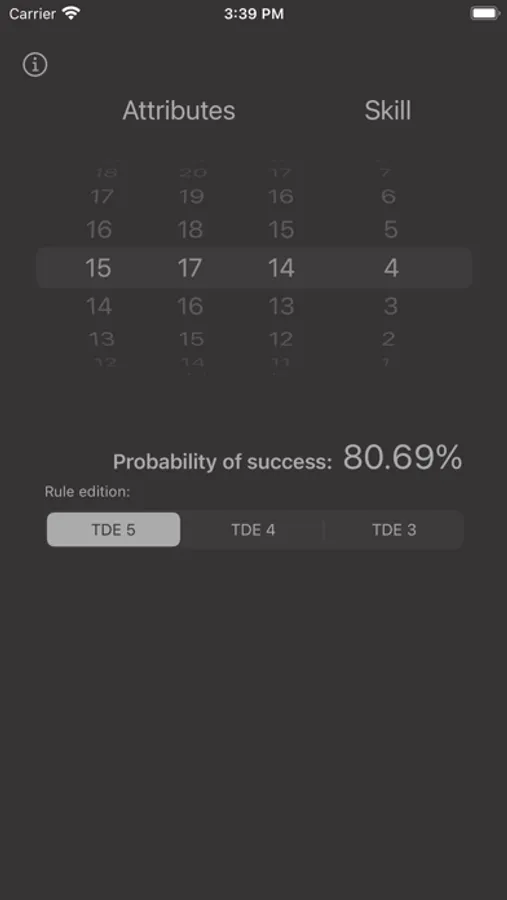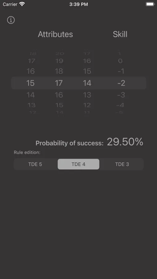 With "TDE Chances" you can calculate the success probability for any given skill check for the German role-playing game "The Dark Eye".