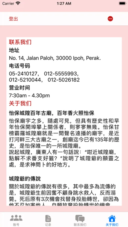 怡保城隍庙App让顾客知道怡保城隍庙的资料以及历史。除此之外,外地的人还可以注册账号以及增加家庭成员,还可以随时随地地查看自己以及家人的膜拜记录。如果有任何问题,还可以使用我们的App咨询城隍庙的员工。